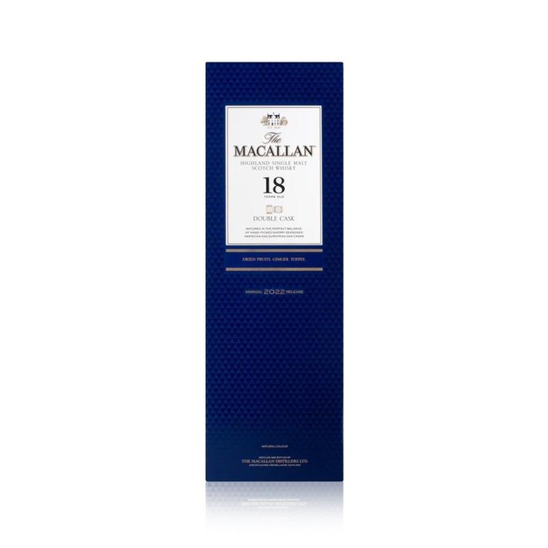 Macallan Double Cask 18 Years Old, dokonale vyvážená single malt whisky zrála 18 let v amerických i evropských dubových sudech s kořením po sherry. Sherry kořeněný americký dub dodává jemnému koření evropského dubu jemnou vanilku a dodává whisky sladší, teplejší chuti a charakteru.